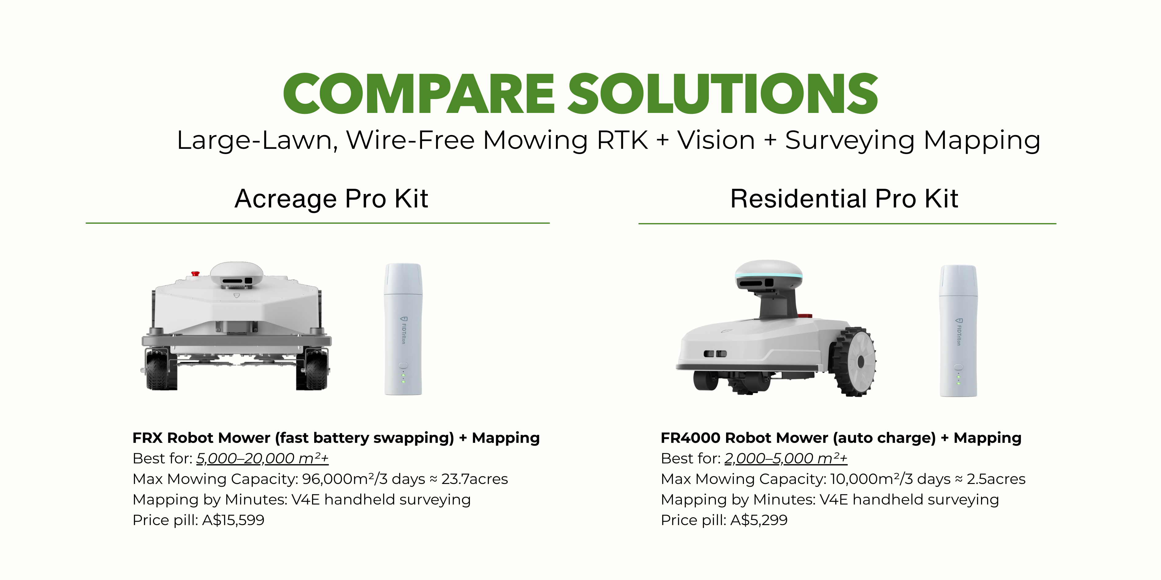 FV2000:1 KWh; up to 320 min runtime per charge/8,000m²; ~240 min recharge.
