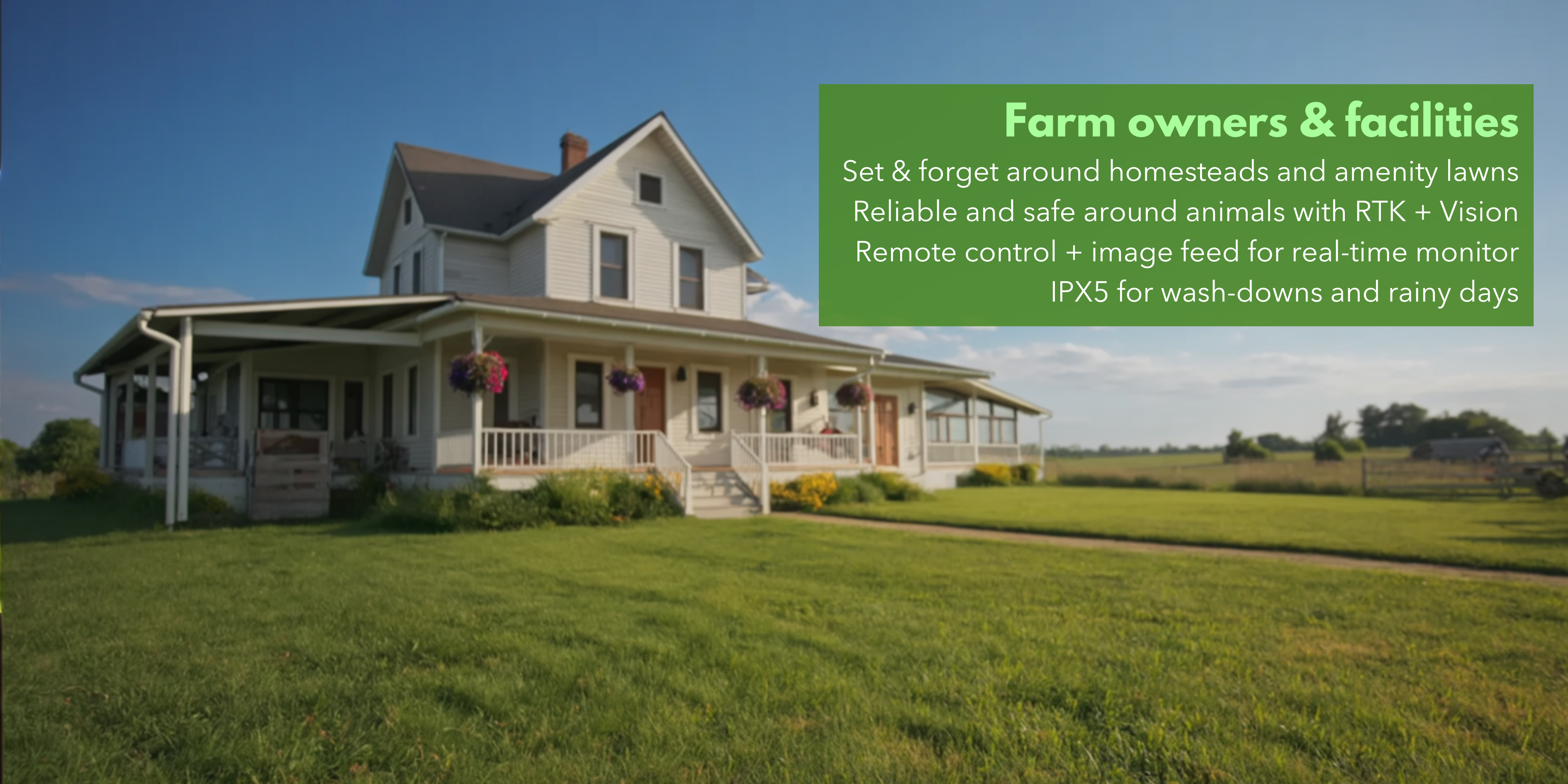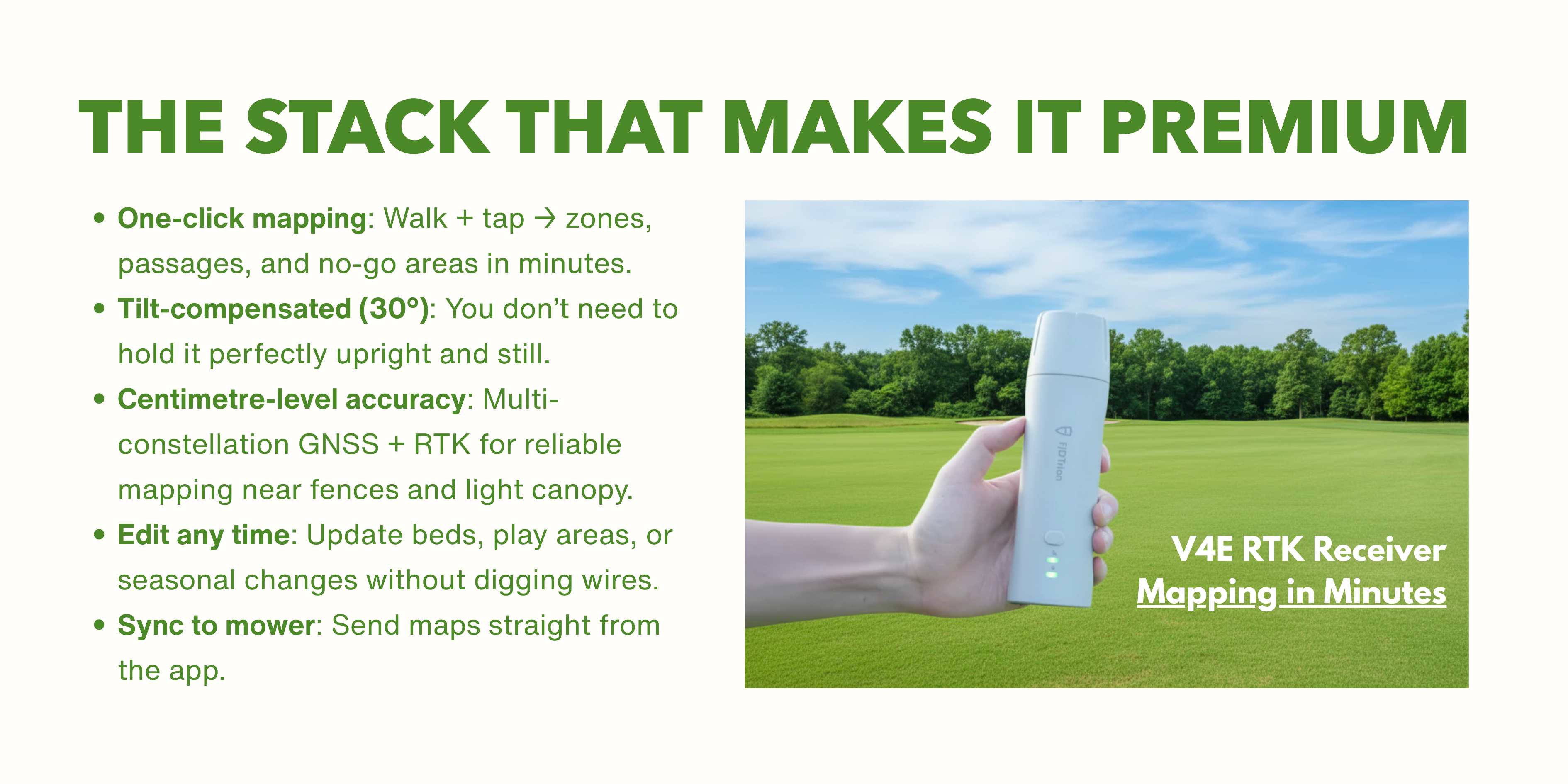 - RTK + Vision navigation for precise, wire-free boundaries and reliable operation under trees.