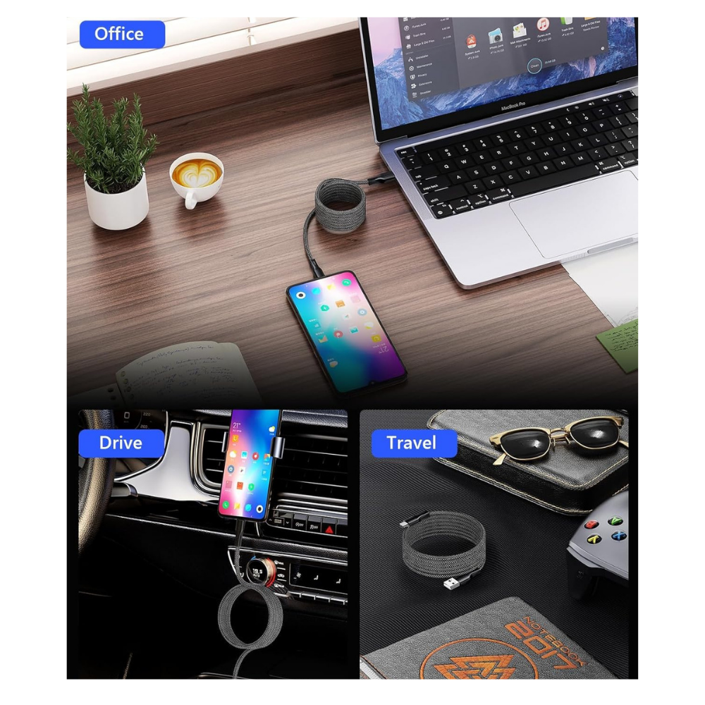• Auto Magnetic Self-Coiling:Built-in magnets snap the cable into a tidy coil in seconds — no manual wrapping needed. Perfect for desks, cars, travel, and everyday use.